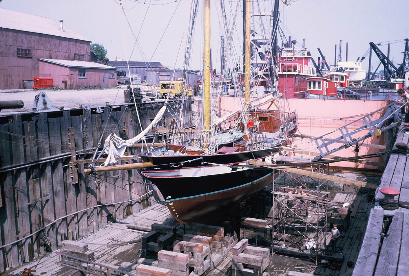 The first ship in the Dry Dock was the passenger ship St. Lawrence. The stone building is now part of the Marine Museum of the Great Lakes.